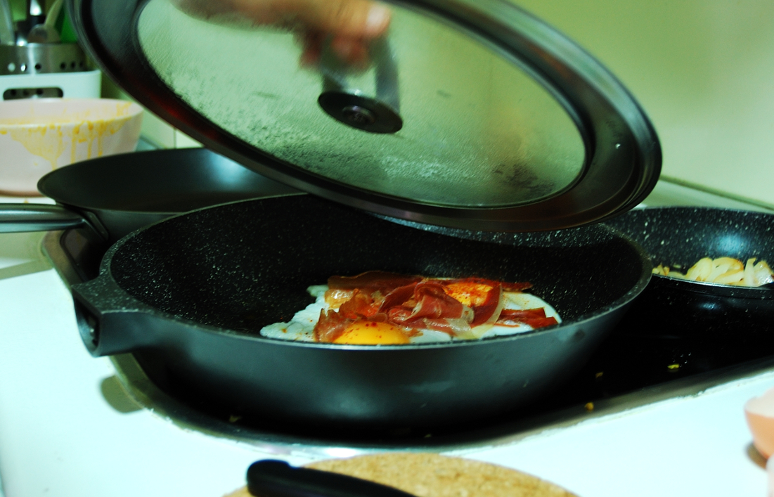 Mientras dejamos que la patata repose un poco prepararemos los huevos. Para ello pondremos un poco de aceite en una sartén a fuego medio (lo justo para que no se peguen los huevos) y cuando este caliente echaremos con cuidado los huevos con un poco de sal. Tapamos la sarten para que el calor se concentre y se hagan uniformemente.
