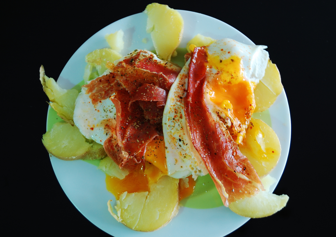 Aprovechamos para cortar las patatas en rodajas y cuando veamos que la clara del huevo está cuajada es momento de colocar con cuidado los huevos encima de las patatas. Coronaremos el plato con el jamón serrano, un poco de orégano y pimentón al gusto.